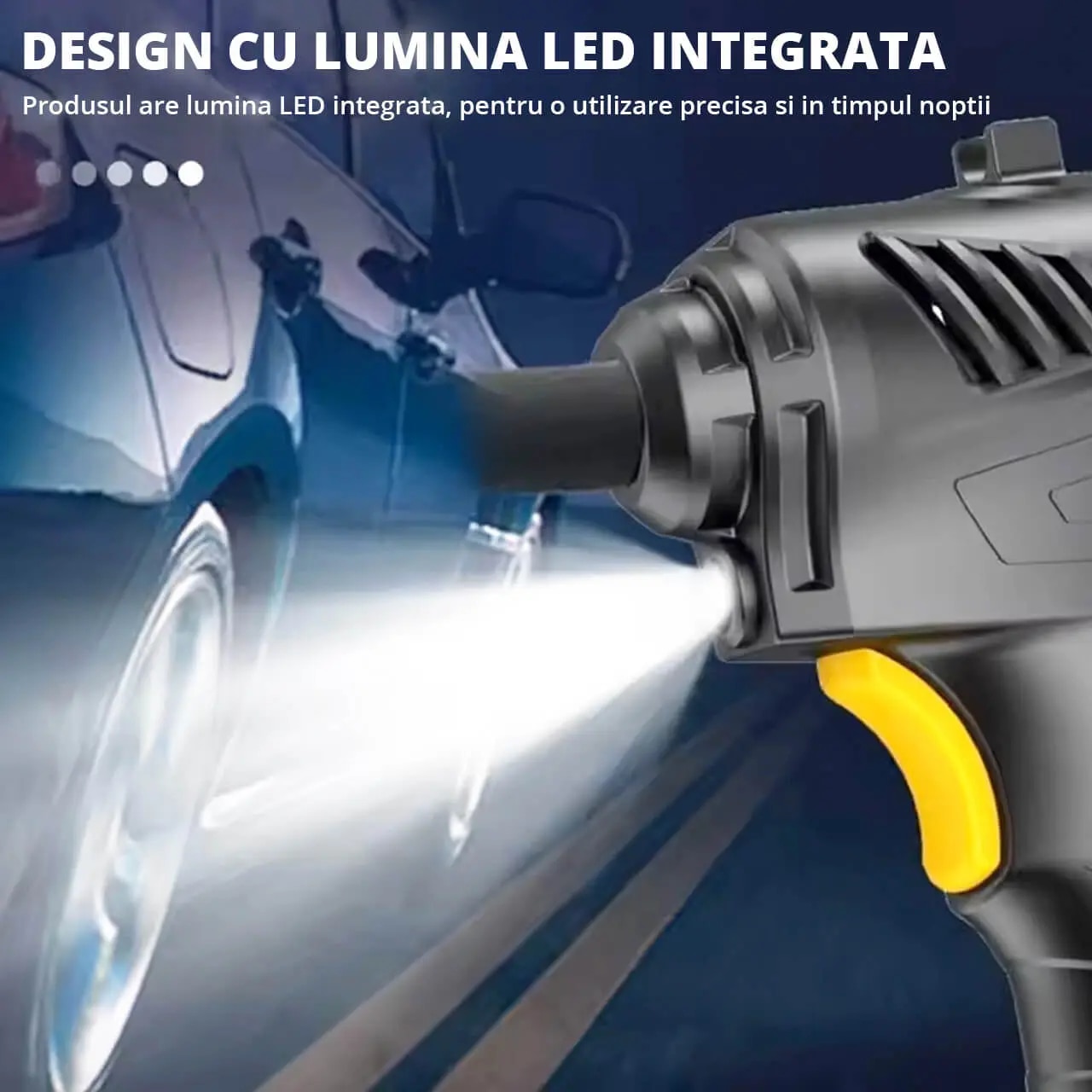 Compresorul este echipat cu un LED ultra-luminos, care nu doar că facilitează umflarea anvelopelor în întuneric, dar poate fi utilizat și ca lampă de urgență. Această caracteristică este extrem de utilă în cazul în care aveți o defecțiune pe marginea drumului în timpul nopții, permițându-vă să lucrați în siguranță.